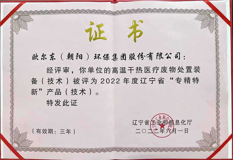 欧尔东20年来持续坚持专业化发展战略,长期专注深耕并成功贯通医疗废物处置全产业链,荣获2022年度“专精特新小巨人”企业荣誉称号!